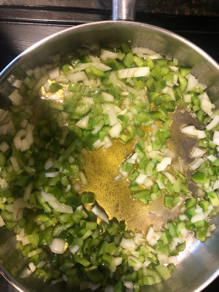 Now, if you can multitask, in a soup kettle on medium low add 3 tablespoons oil and onions, pepper, and celery. Cook for 10 minutes, stirring occasionally.