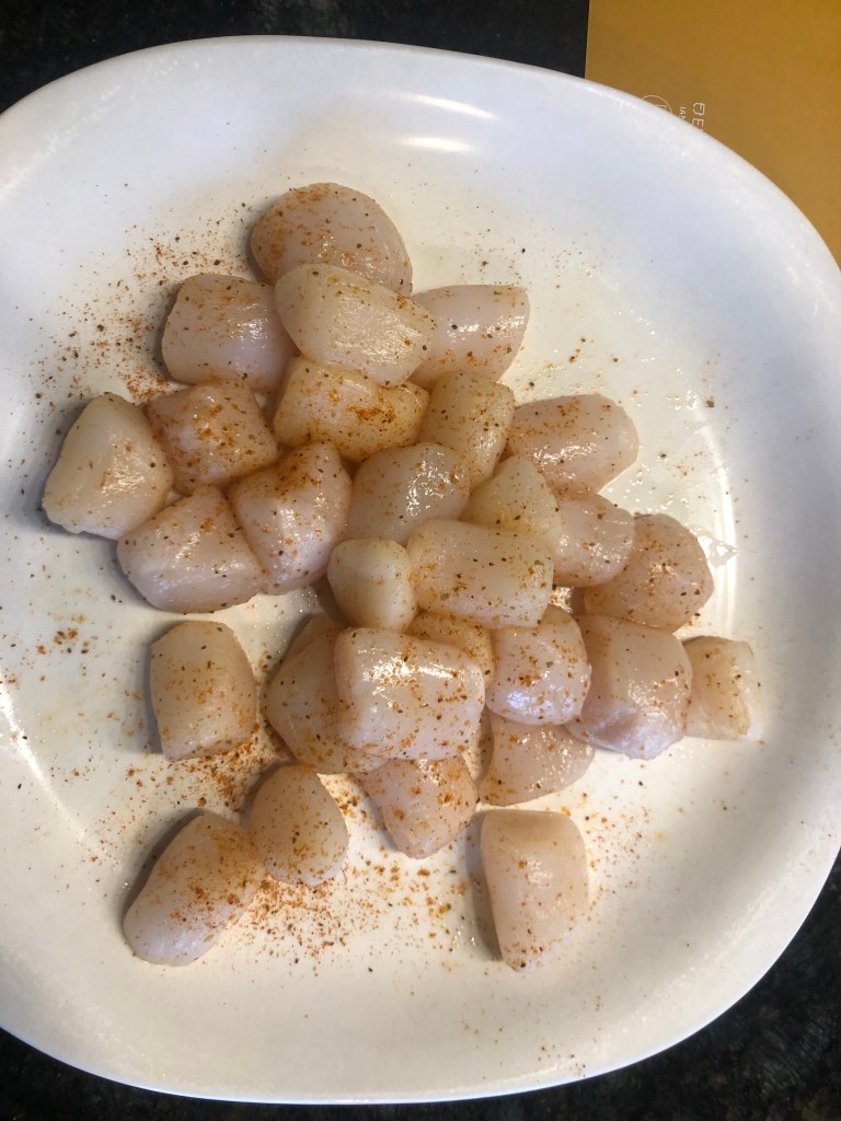 Sprinkle scallops with Old Bay and pepper; add to wok and sear for 30 seconds on both sides. Remove to a paper towel.