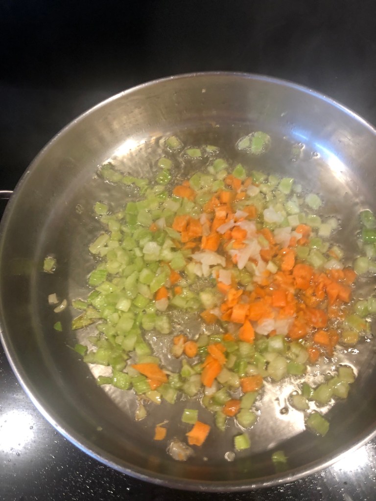 In a large skillet on medium heat, add oil, carrots, onions, and celery; cook for 5 minutes stirring occasionally.