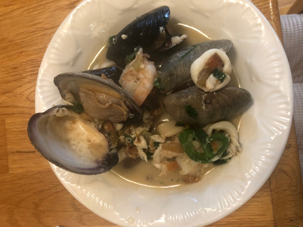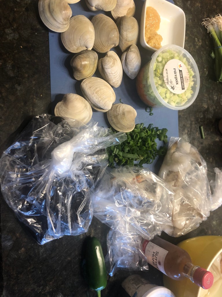 I have done cioppino before on this blog but never like this. My original take was pure San Francisco traditional. Today, we go to Southeast Asia and Thailand so no tomato and oregano; we use ginger, coconut milk, peppers, and heavy garlic and green onion. Thanks to Crosby’s Crabs for hooking me up with the seafood. I hope you like it.