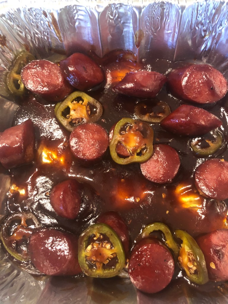 Simple ingredients treated with respect. I did this as an appetizer for Easter, and it went over well. I know you might think that smoking smoked sausage would make the flavor too intense, but with the jalapeño and BBQ sauce it works perfectly. I hope you like it.