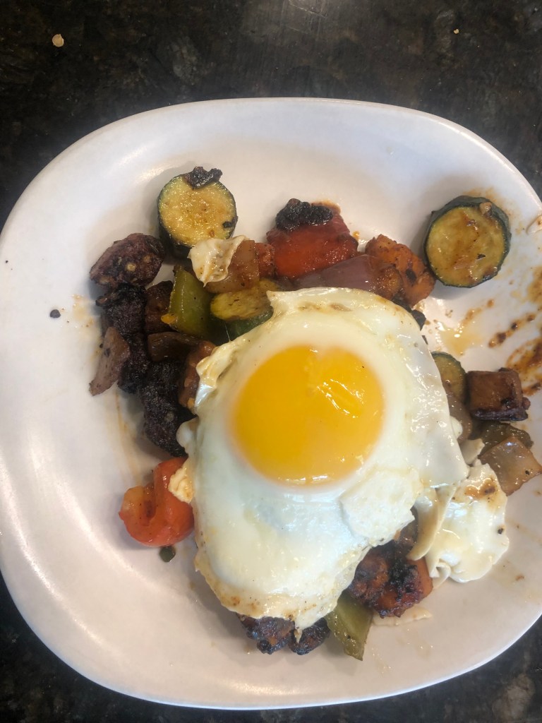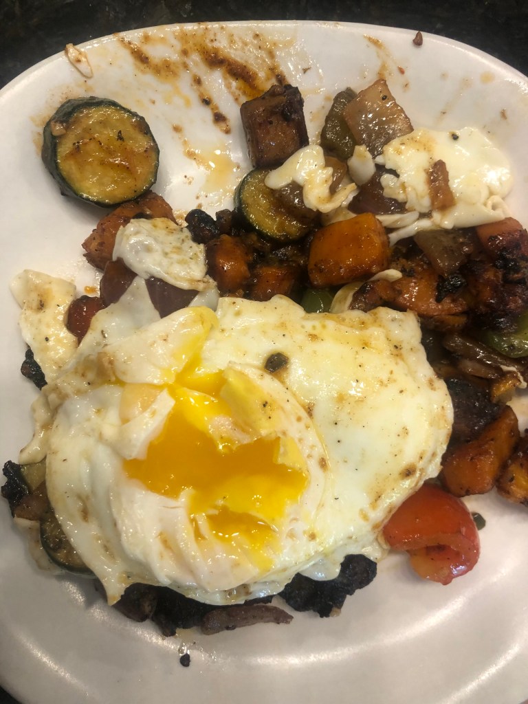 I saw this on Bobby Flay’s Brunch show. I made a few changes to reflect local ingredients and the taste of my guests. The jerk seasoning cuts through the rich pork belly. I had my good friends at Abundant Acres whip up a trial batch of their Poppi’s Jerk Seasoning. Now, this is not a quickie recipe; you braise the pork belly (from Ruckers Farm) for 2 1/2 hours, then smoke it for 1 hour.(Or you can buy some Jerk bacon at the expensive grocery store) The dish includes spicy succulent pork belly, spicy peppers, sweet potatoes, onions poblano peppers, and cranberries for some sweetness. I hope you like it.