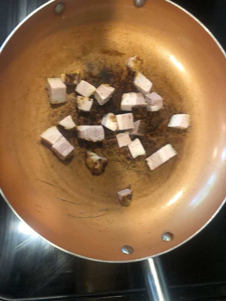 In a large cast iron skillet on medium add pork belly cubes and brown, rendering off fat. Remove to a paper towel.