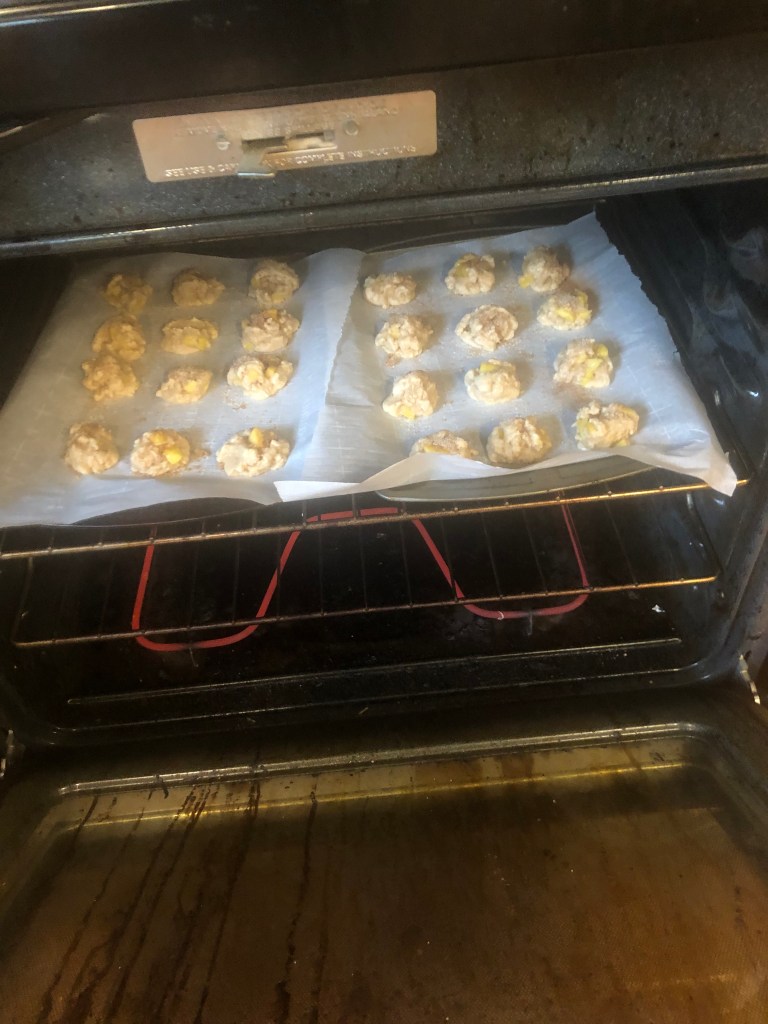 Drop 1 1/2 inch scoops of dough on parchment- lined baking sheet.