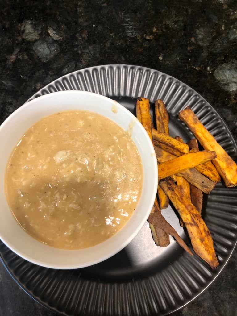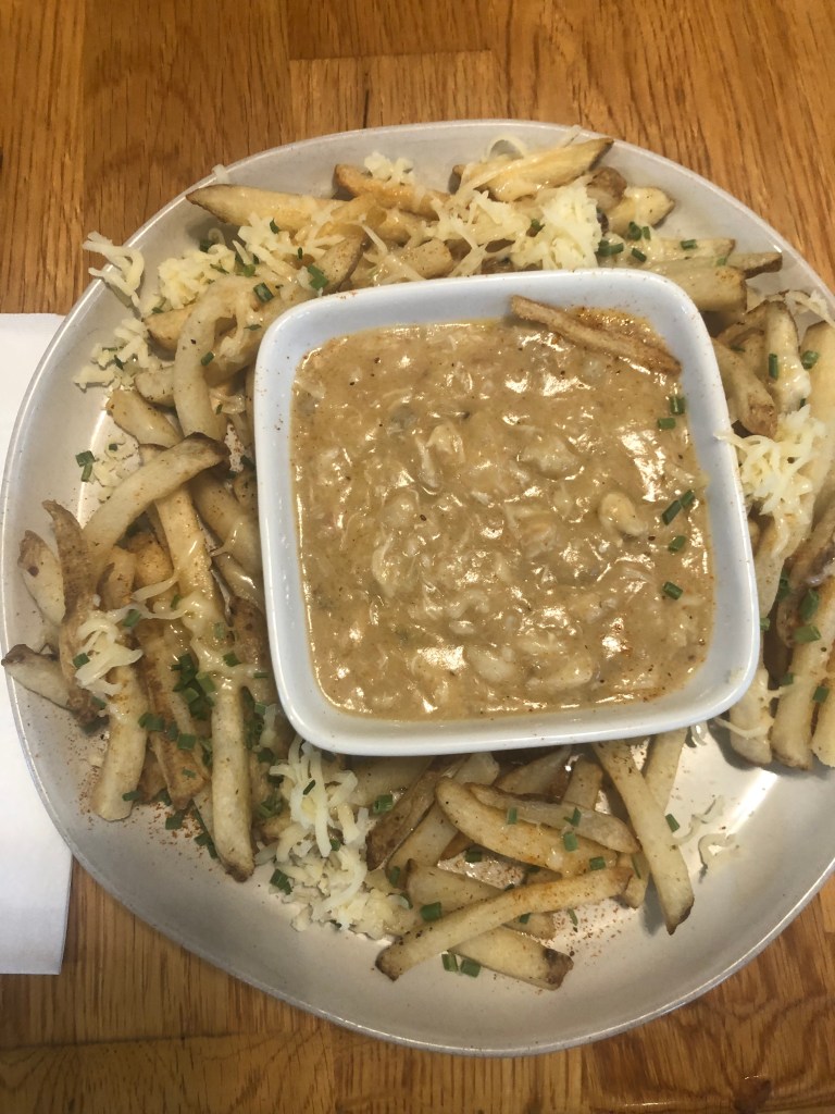 I had this myself in a place called Big Joes Raw Bar in Virginia Beach. My order was fries and a bowl of she-crab soup. The soup led me to thinking poutine because it was so thick and rich. So, I poured the soup on the fries; then my server said I wasn’t the first to do that. I decided to duplicated the soup and the fries. Ah the fries! They were twice fried and coated with a Old Bay spice. The cheese was my idea, and it just puts the dish over the top. I hope you like it.