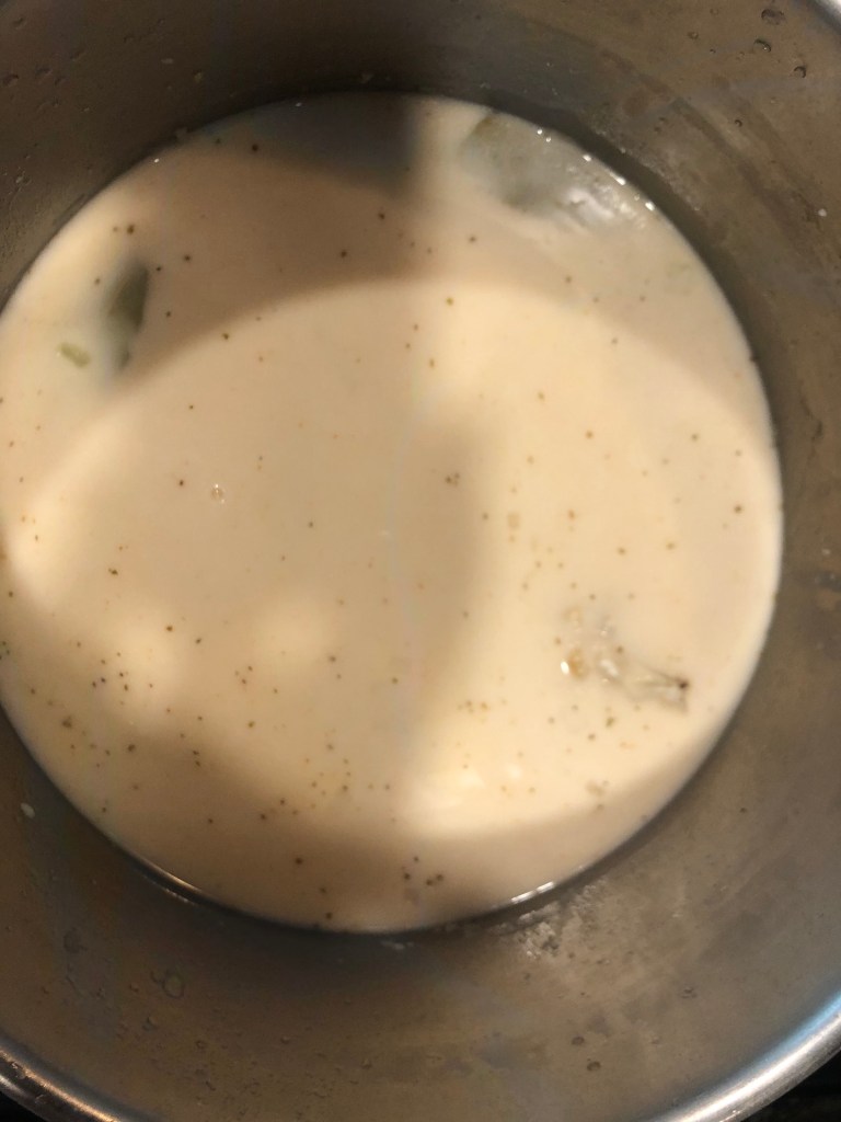 In a soup kettle on medium heat, add butter and flour and cook for 10 minutes stirring until it becomes a light blond color.