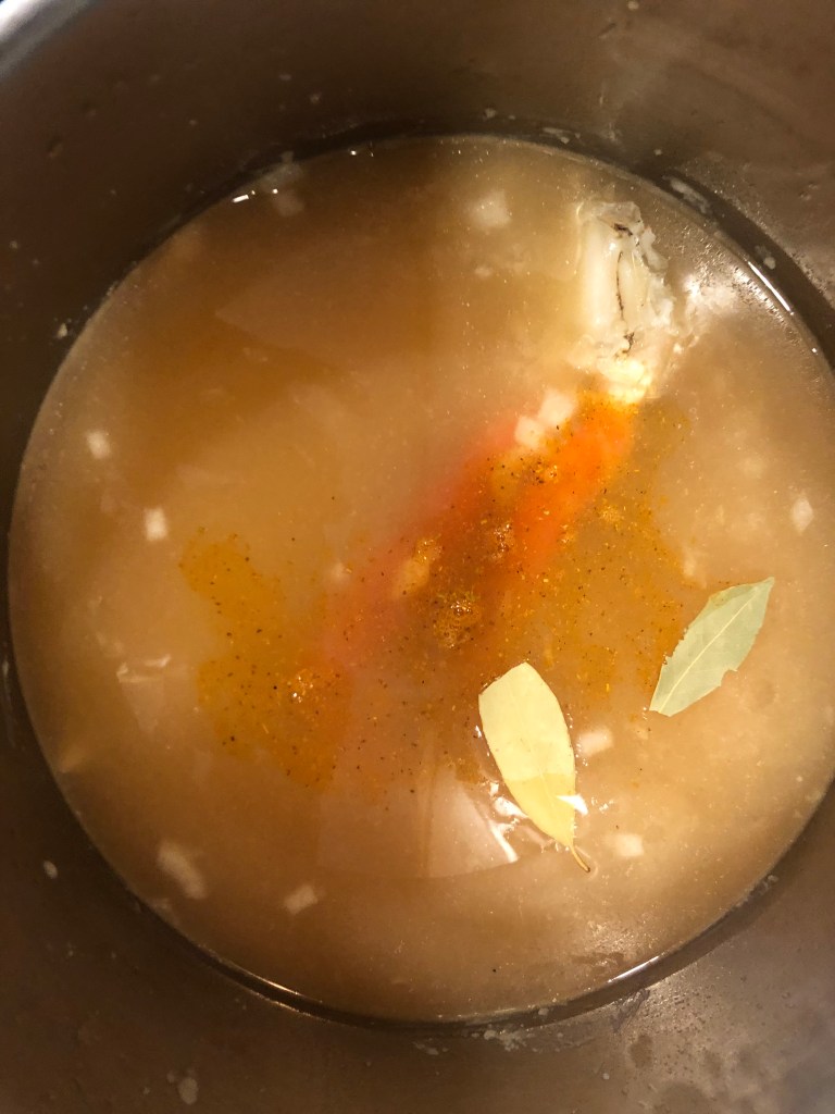 Add clam juice, stock, water, crabs, Old Bay, bay leaves, and simmer for 2 hours.