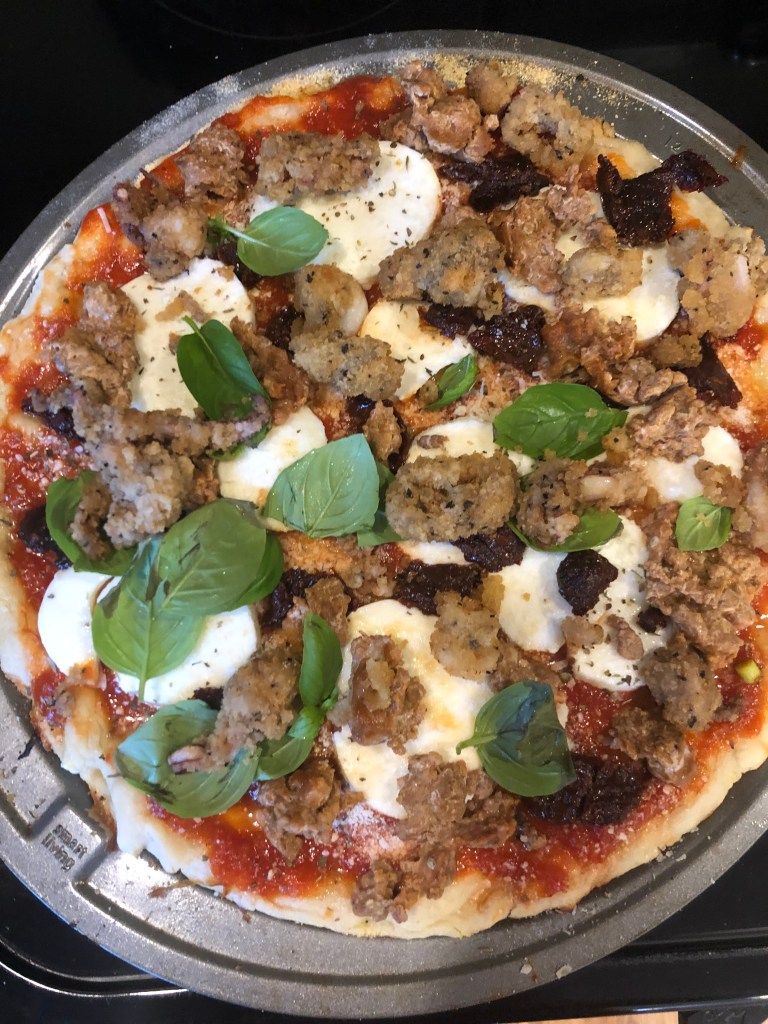 Pork and seafood make a great combination. So why not on a pizza? Yes, I know I did a clam and bacon one a few years ago, but we are going spicy chorizo with crispy calamari. I also threw some olives for some salt, sun dried tomatoes, and some arugula for a peppery bite. The bite is complete with the spicy chorizo and briny calamari. I hope you like it.