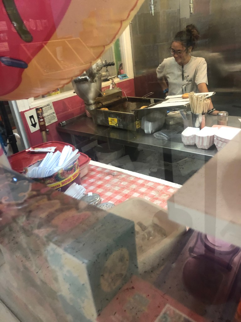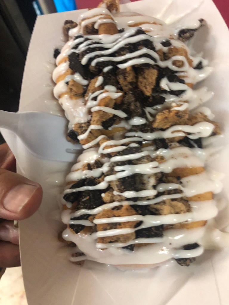They presented their most popular donut: the great old-fashioned donut with a vanilla glaze and topped with crushed chocolate chip and chocolate sandwich cookies. Wow amazing! You can see them drop the batter in the oil. Two minutes later, a quick flip, two more minutes, and it’s time to decorate. The finished product is hot and decadent and sweet and totally delectable. My wife, who doesn’t like donuts, was taking her turn with the fork. We didn’t try the ice cream, but I saw a number of people enjoying it.