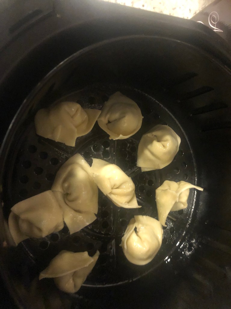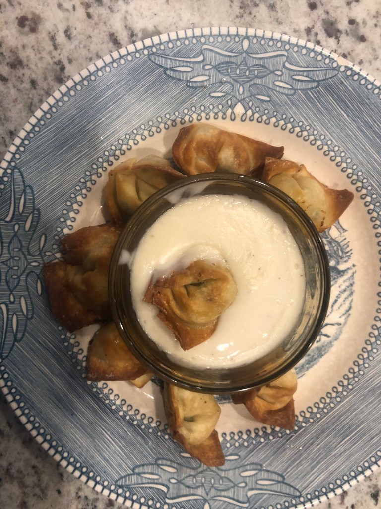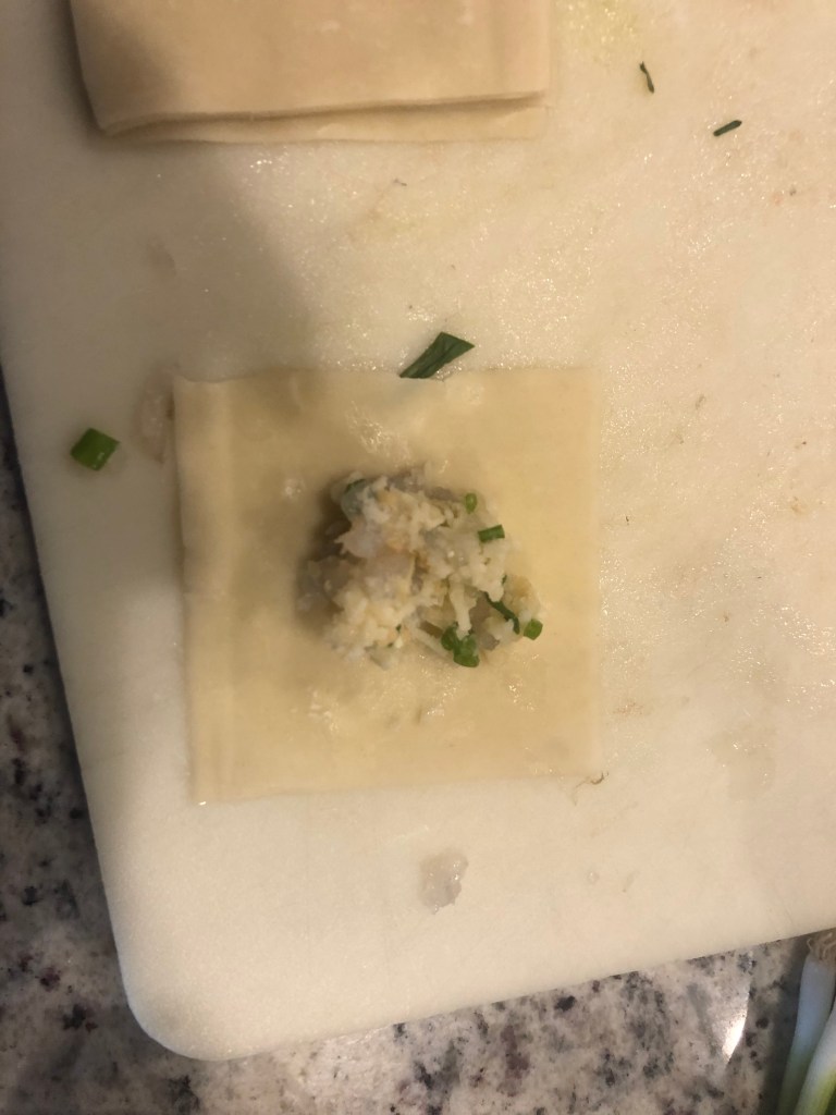 Place 1/2 teaspoon of mixture on center of wrapper; wet each edge and fold top to bottom; press to seal. Then pull solid bottoms corners to touch, sealing completely.