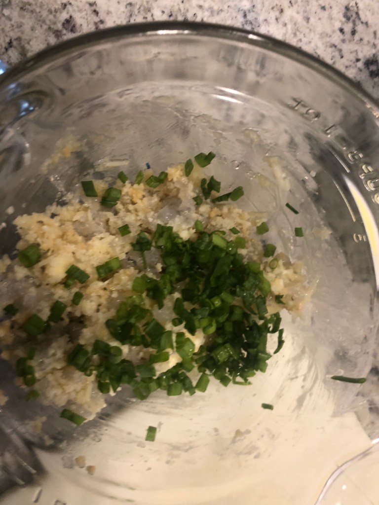 Either use a food processor or knives to make the shrimp into small pieces. Add to bowl.