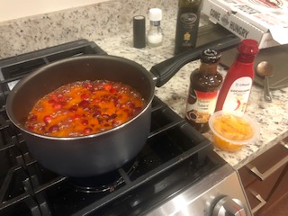 I’m decided to change up my cranberry sauce this year and decided to go with Asian flavors. Now, it happens that I’m doing an orange glaze on my turkey, so life works out. We start with tart cranberries, add deep brown sugar, warm 5 spice, sweet orange, and spicy gochujang. I hope you like it.