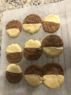 My wife took an idea I had farther than I could and made these cookies. It was my thought to add a chocolate component to the cookie, well, two actually. Half the cookie dough is chocolate and half the cookie is frosted with chocolate and black food coloring. Here’s the shortcut: Pillsbury cookie mix. So you get showy cookies in 1/2 the time. I hope you like it.