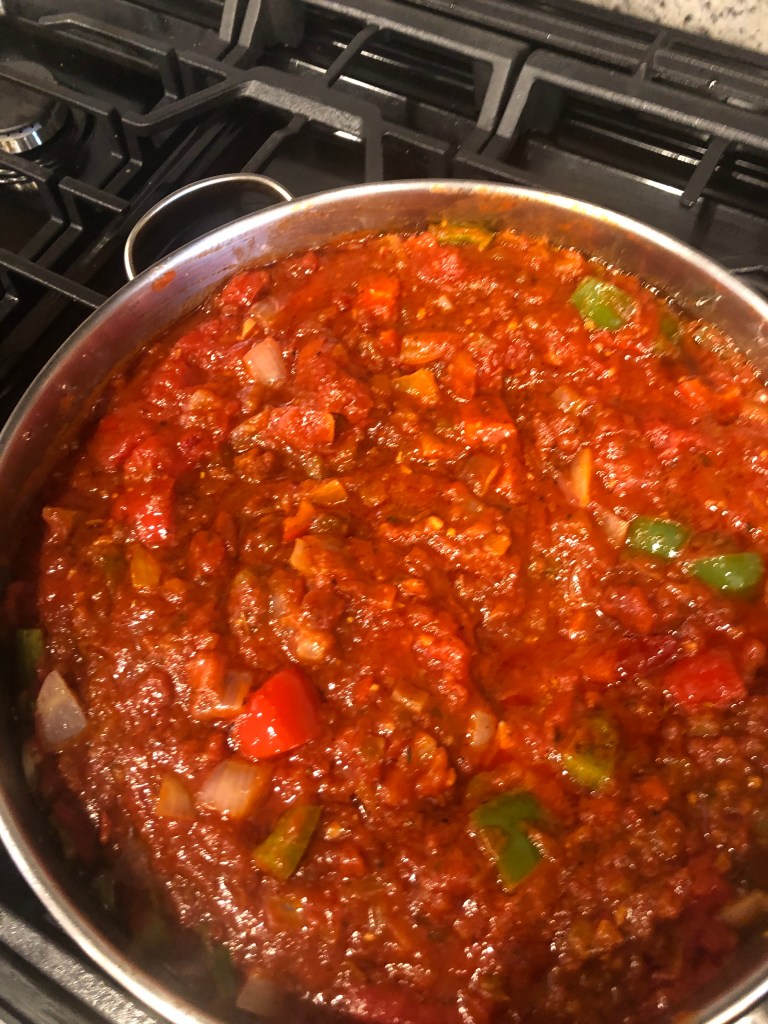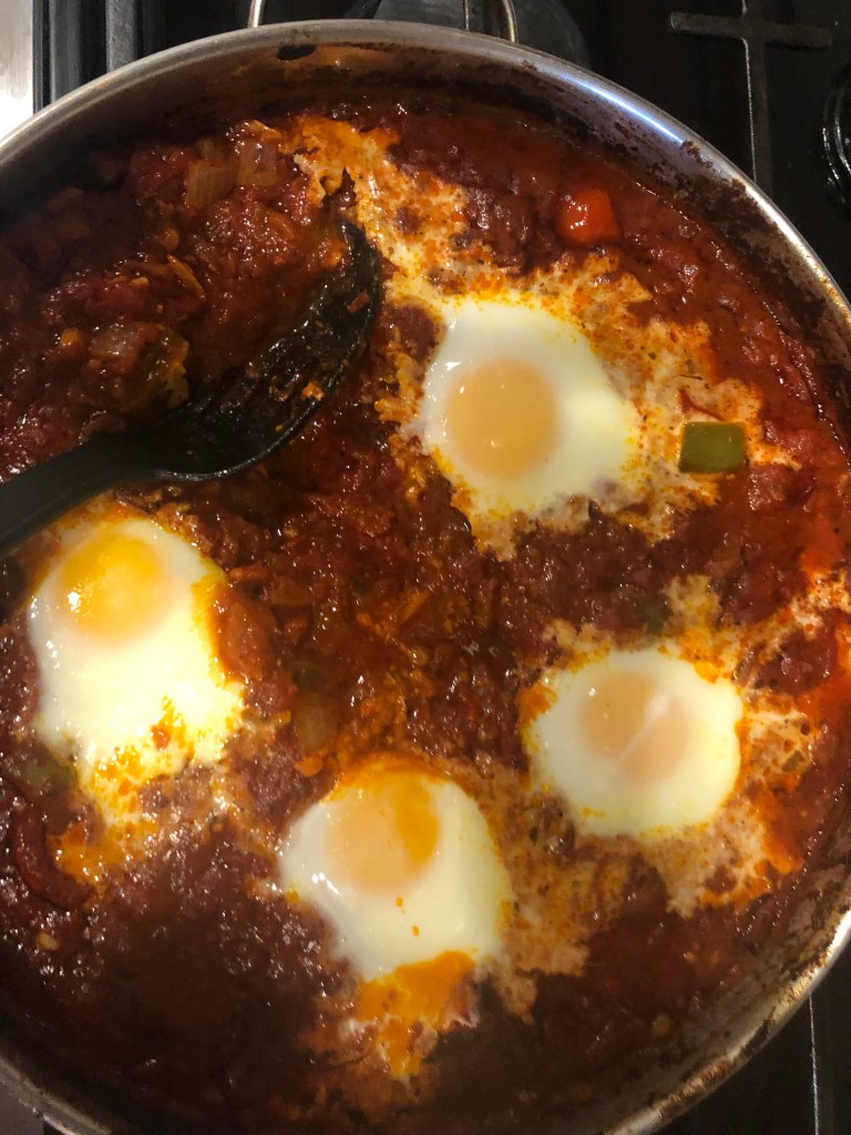 This is a dish originally from Morocco but popular throughout North Africa and the Middle East. It has tomatoes, peppers, onions, and lots of spices. Then comes the eggs cooked in the sauce, so when you break the yolks, they enhance the dish. There is some heat that comes with this dish, so if it’s too hot, cool it off with some honey. I hope you like it