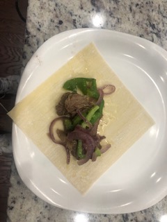 Add 2 tablespoons of beef to wrapper, top with peppers and onions, about 1/3 of the way up from bottom. Pull up bottom point, fold in outside corners while rolling up. Seal with water. This will probably not roll correctly, so wrap in a second wrapper. Spray with cooking spray on both sides.