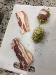 Now would be time to wrap in 1/3 of a strip of bacon. If you want to be me, I’m doing 1/2 with bacon and 1/2 without.