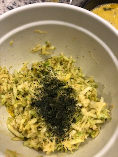 Peel and grate zucchini. Remove as much water by ringing out the water in cheese cloth.