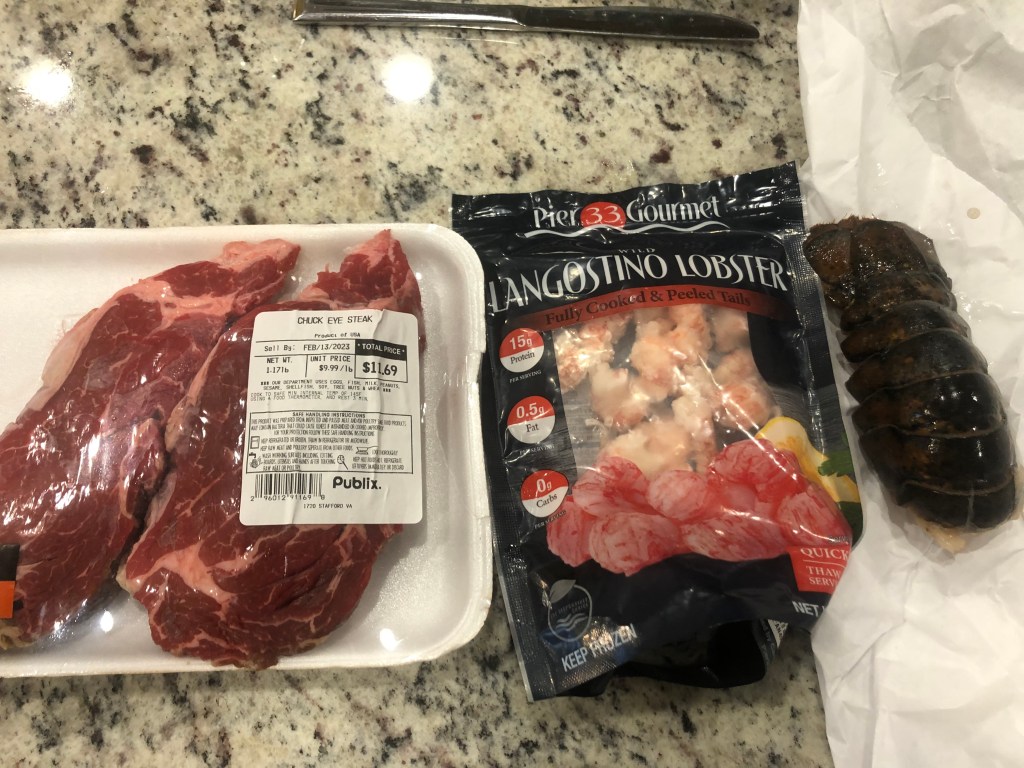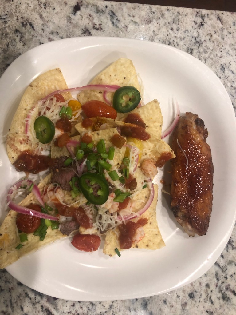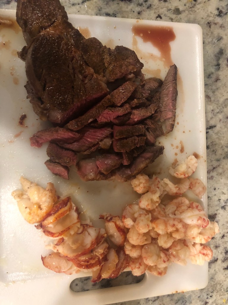 A Valentine’s dinner at a chain will set you back $40 per person. You may get a little lobster, but probably just shrimp, an 8-ounce sirloin, and your choice of broccoli and a baked potato. It will be pleasant and forgettable. This, I think, is not going to be the same old thing. Buttery lobster, medium rare mock tender steak, six cheese Italian mix, pickled onions on top of crunchy tortilla chips. There is also some roasted tomatoes and some chives for freshness. This could also be an untraditional Valentine dinner and maybe pop for a bottle of wine. I hope you like it.
