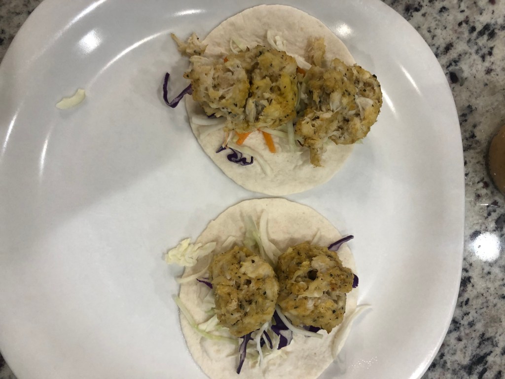 I actually had this at Applebees; well, except they used fish and a creamy slaw, and I used an Asian slaw and lump crab meat, so this is nothing like Applebees. Thank you for the idea, feel free to wait by the mailbox for your residual check. I did use street tacos, so it’s less fatty. I used sweet and tangy remoulade, so I’ve got that going for me. I also added mandarin oranges for a little sweetness. I hope you like it.