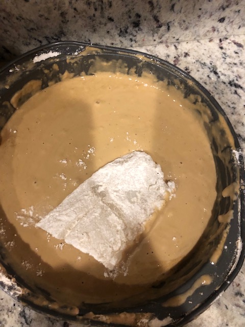 In pie pan 2,add 1 cup of flour, beer, and beaten egg. Mix. It should be thick, but if too thick add more beer. Refrigerate for 20 minutes.