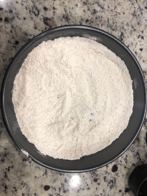 In pie pan 1, add 3/4 cup flour, Old Bay, garlic powder, and black pepper.