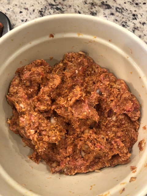 This is a confused meatball. Let’s start with chorizo; that’s Central America, but then we have ricotta and parmesan cheeses, Italian. Then we have the Japanese Panko bread crumbs and the African spice mix. Confused, right? But a soft tasty meatball. The chorizo is from Hidden Creek Farms and the ground beef is from Sierra Linda Farms. I hope you like it.