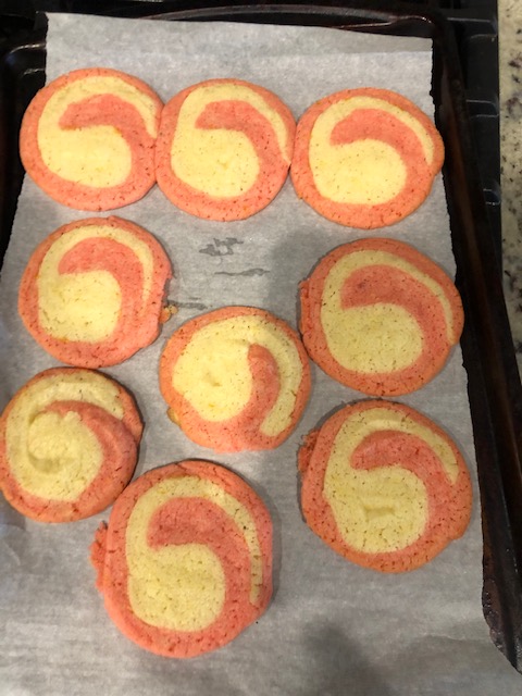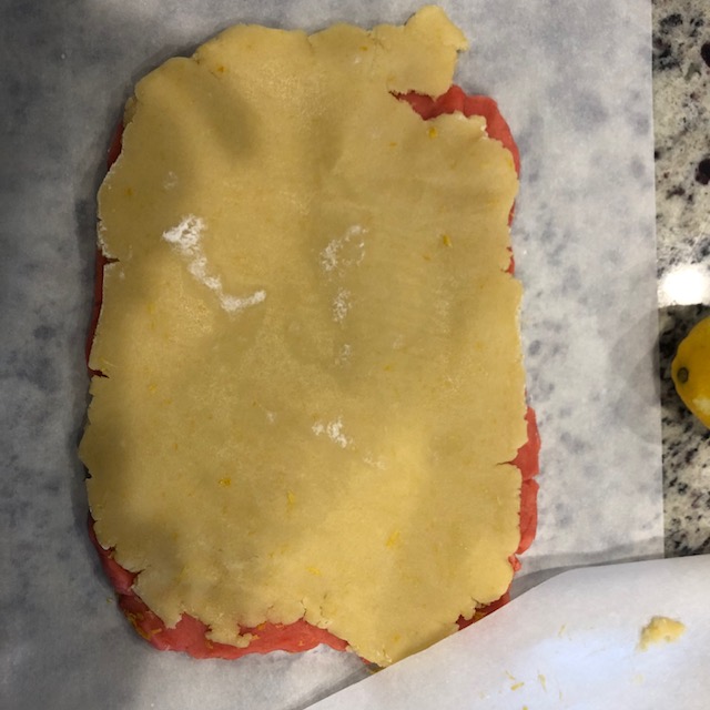 Place lemon dough on top of strawberry dough and using parchment roll tight.