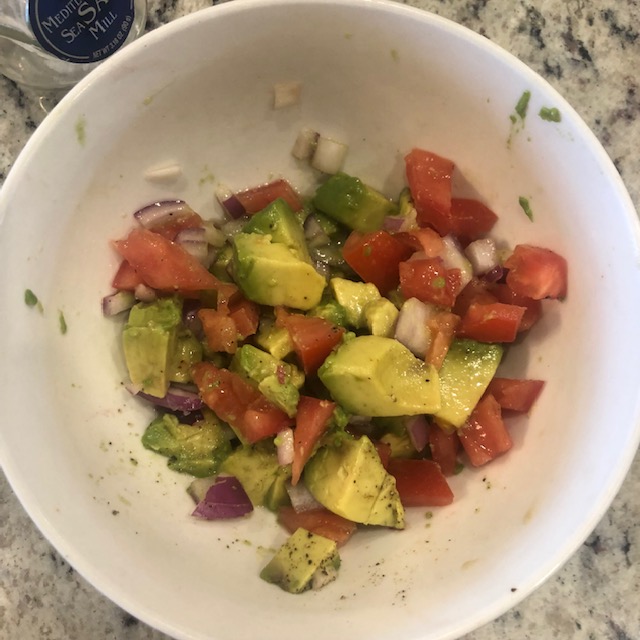 In bowl add tuna, avocado, onions, tomatoes, salt and pepper to taste.