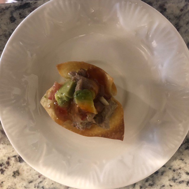 Here is an hors d’oeurve to wow at brunch. Simple quality ingredients can make all the difference – don’t go cheap! Spicy blackened tuna and avocado bring big flavor. Lime juice, tomatoes, and onion break up the richness topped with the sweet chili sauce. I hope you like it.
