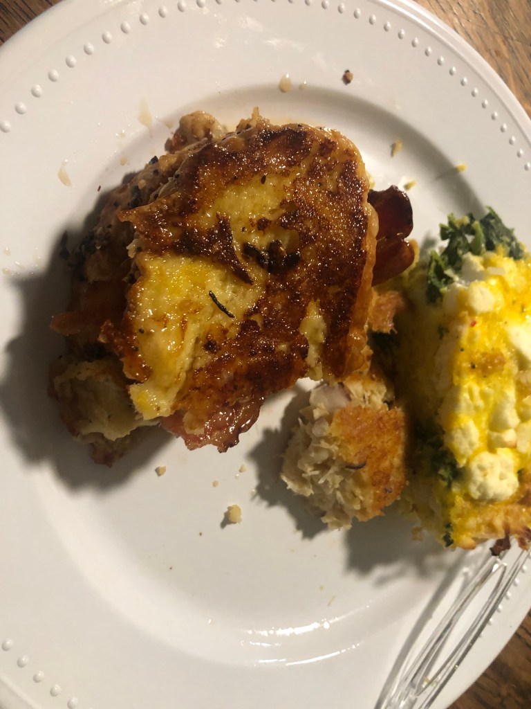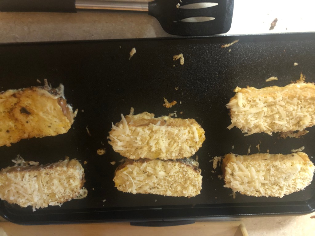 Everyone thinks of French toast with butter, syrup, and a sprinkle of powdered sugar; you can see it in your mind. Well, I’m thinking savory. WHO says it has to be all sweet? How about garlic and herbs with a parmesan/Asiago crust? Yes, I said it: French toast with a parmesan crust. I dare you to not put syrup on it. The herbs will bring a great note, and the garlic is just the right note.