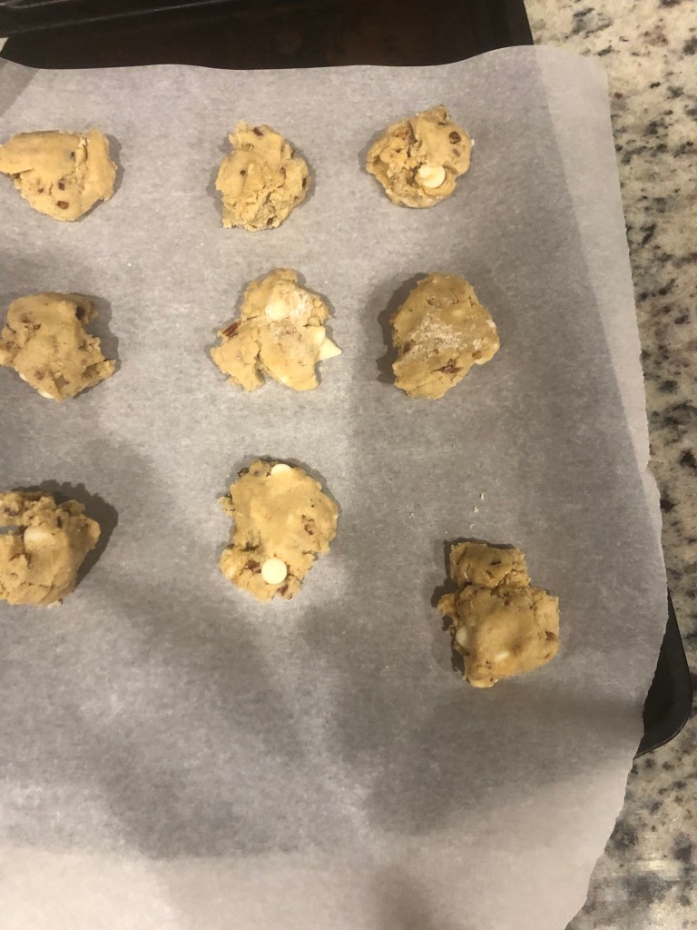 I was trying to make the ultimate Georgia cookie. Since I couldn’t figure out how to add pulled pork to a cookie, I had to go with what I thought were Georgia flavors. Georgia staples are peaches, pecans, white chocolate chips, and of course, Southern Comfort. Now, some cinnamon and nutmeg tie everything together. I hope you like it.