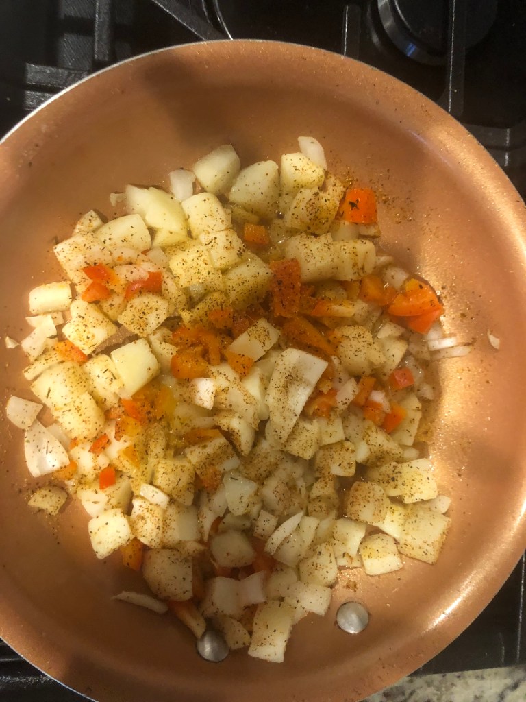 Add potatoes, onions, and peppers; cook until brown, stirring every minute or two.