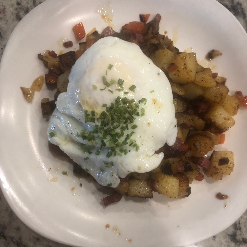 This is a dish that people eat at diners all over America. A simple dish that is simple to do and simple to mess up. (Some of the best is at a diner in Mackinaw City.) My first rule: don’t use the canned meat stuff; make your own corned beef and use the leftovers, or get some good deli corned beef. Corned beef, potatoes, onions, bell peppers, and some spices all topped with a runny egg. I hope you like it.