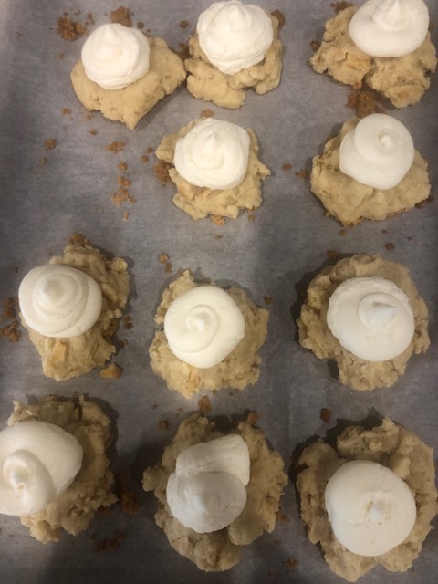 On a parchment-lined baking sheet, add 1 teaspoon of graham cracker mixture for each cookie. Then add 1 1/2 tablespoons scoop of cookie dough on top to cover graham cracker.
