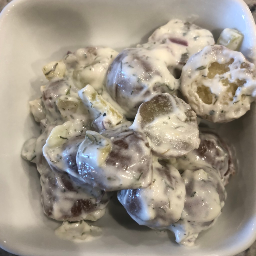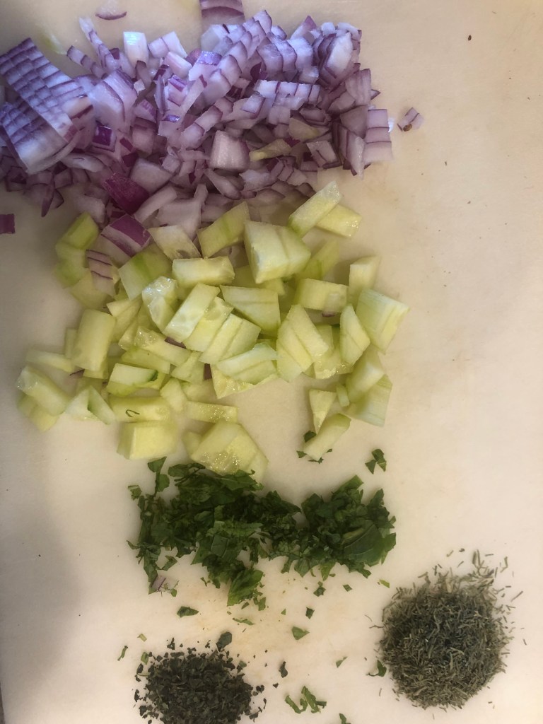 Summer is for BBQ and potato salad. What if you go with grilled lamb? After a trip to the Warrenton Farmers Market, I got some items, and the recipe was under way. Why not Greek inspired potato salad? Mint, oregano, tzatziki sauce, and Greek yogurt. Creamy with a ton flavor. Adding some red onions and cucumber give the dish texture. I hope you like it.