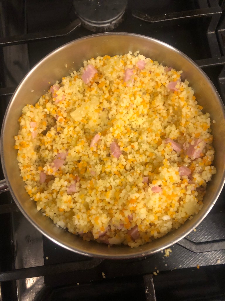 Loco moco is a classic Hawaiian dish considered comfort food. Rice, hamburger patty, an over easy egg, maybe some kind of green, and always some gravy. I have made sure I will never be invited to Hawaii with my changes on the dish. The rice is not going to be invited to the party today. We’re going couscous, ham, pineapple, and Romano cheese, so sorta kinda not really mainlander and not really Hawaiian style. It’s a crazy loco mixed-up world. I hope you like it.