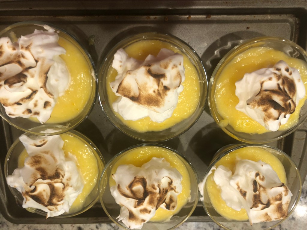 Use a kitchen torch to flame and brown tops of meringues – do not flame the lemon curd.