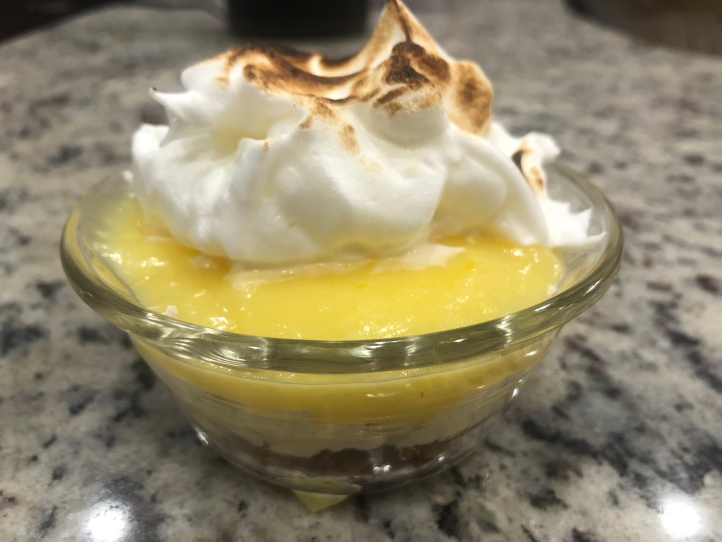 I will do this on a full size version, but for now we keep it small. We take Biscoff cookies and make them the crust, top that with some no-bake cheesecake, then finish the dish with lemon curd and a fluffy yet torched meringue. Tart, sweet, a little crunch, and a little spice. Elderflower syrup magnified the flavors. I hope you like it.