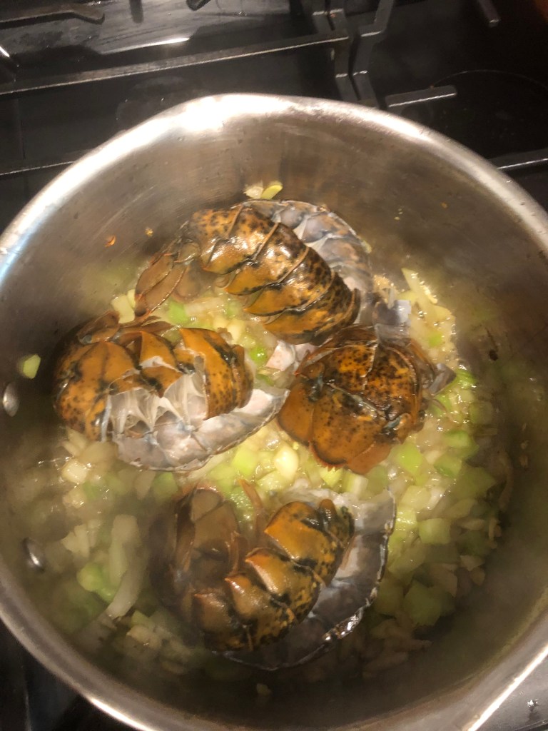 This is homage to the lobster boils on the beach of Nantucket. It has all the components of a classic lobster dinner. I used lobster tails, lobster stock, vegetable stock, onions, celery, fennel, potatoes, bacon, smoked sausage, and some seasoning. Now for me a little sherry never hurts seafood, so it comes to the party too. Now the total cook time is a couple of hours, but the results are worth it. I hope you like it.