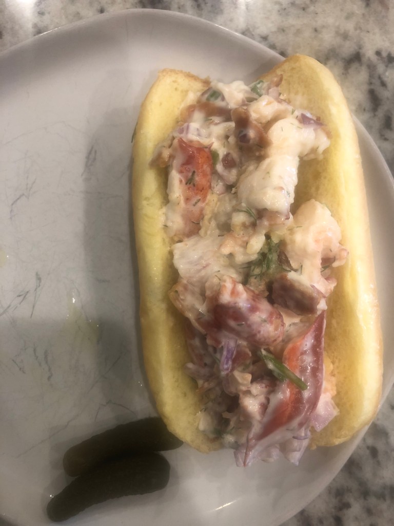 Summer is almost over, so a lobster roll is in order. This is more lobster than salad. It’s more New York than Maine in style but still has great flavor. I got the lobster meat from Crosby’s Crabs with bacon from A to Z Butcher shop. I poached the lobster in butter until done. To that base I added dill, chives, shallots, Old Bay, and mayonnaise. Now, they don’t sell lobster rolls in Northern Virginia, so I had to settle for a brioche hot dog roll. I hope you like it.