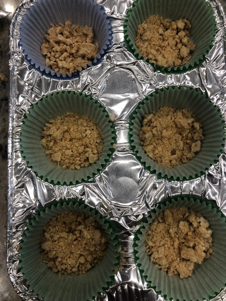 Add a layer of crushed cookies to bottom of lined cupcake pan.