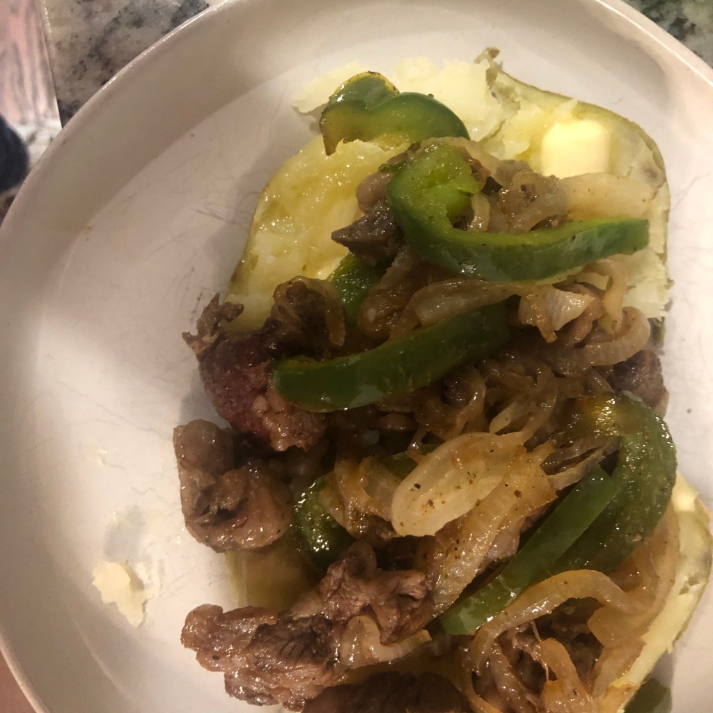 I eat baked potatoes frequently, sour cream, chives, butter, maybe some bacon and some cheese. That is fine, but how about thinly cut grilled steak, peppers, onions, and some cheese sauce? Yes, I said cheese sauce. You could go ahead and add some some sour cream – I dare you to draw the ire of the people who threw batteries and booed at Santa at an Eagles game. Really, that’s your plan (paraphrased from the Dark Night)? I hope you like it.
