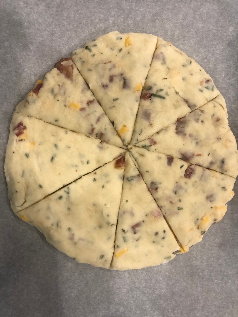Place dough on a floured counter. Kneed four times then add 1/3 of bacon and cheese. Fold and kneed 3 times. Repeat until all bacon and cheese.