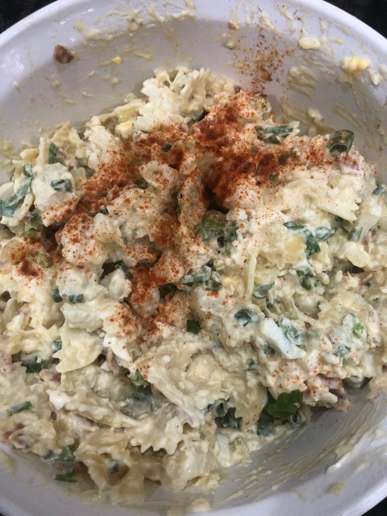 Many people feel that a cook out isn’t complete without potato salad. In Hawaiian cookouts have macaroni salads or egg salads. This is all three in a bowl. Now the genius because each family does it differently so to quote Forest Gump you never know what your going to get. Potatoes, elbow macaroni, eggs, green onion, mayo, mustard and in my version avocado and some hot sauce. I hope you like it.