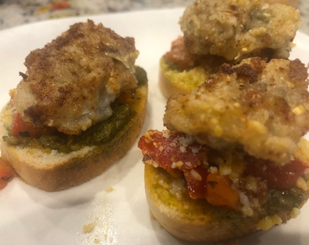 These are two things I have on or about Thanksgiving. Oysters are in season, and the bruschetta with cheese is always tasty. In this case red pepper bruschetta plays well with the briny oyster. I did switch out Romano cheese for parmesan because I wanted to reinforce the salty. This is also a quick dish. I hope you like it.