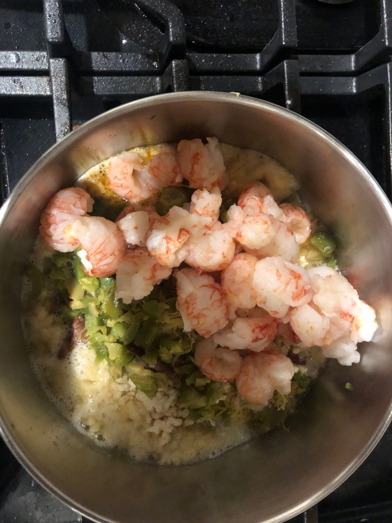 In a sauce pan on medium add 4 tablespoons butter, poblano, shallot, and green olives. Cook for 4 minutes.