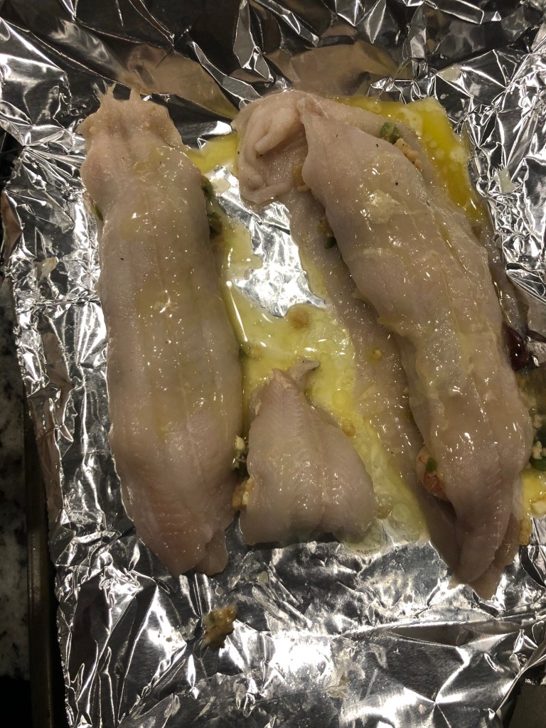 Place larger pieces of sole on a foil-lined baking sheet. Add stuffing and top with another piece of sole. Top with Old Bay and 2 ounces melted butter.