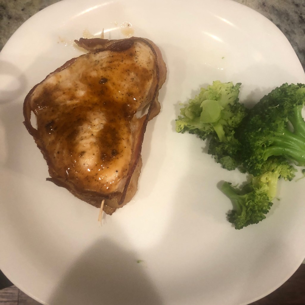Swordfish eats more like meat than fish, so I treated it that way. I wrapped it in bacon and coated it with a cherry jalapeño bbq sauce from a trip to North Carolina. I hope you like it.