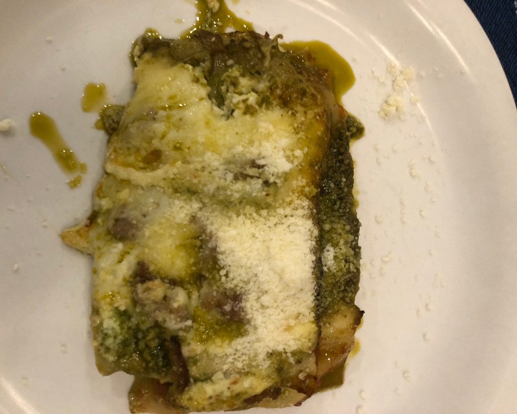 Add two tablespoons of pesto to pan. Add 3/4 cup of ricotta mixture to pan. Add 1/3 of sausage and top with pasta sheet trimmed to fit.