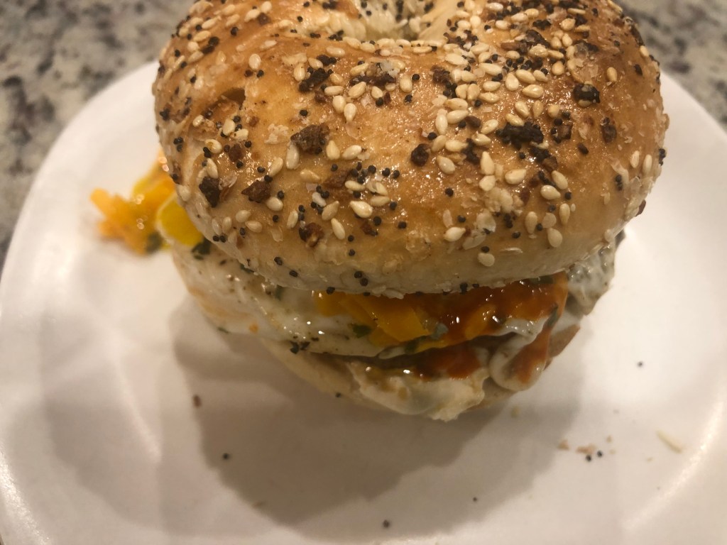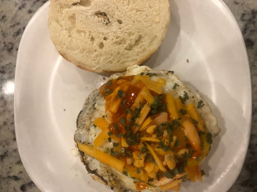 This is a submission from my sister-in-law, A. J. This came from the cabin in the woods nestled deep beneath the pines in northern Michigan. Now, the key to this recipe is the order of the assembly and the treatment of the cheese and egg yolk. After flipping the eggs, break the yolk and add some cheese. I understand that the sausage is crumbled up north, but I like the patty idea better, so that’s what I did. An everything or plain bagel will work best – no sweet strawberry maple here. I hope you like it.